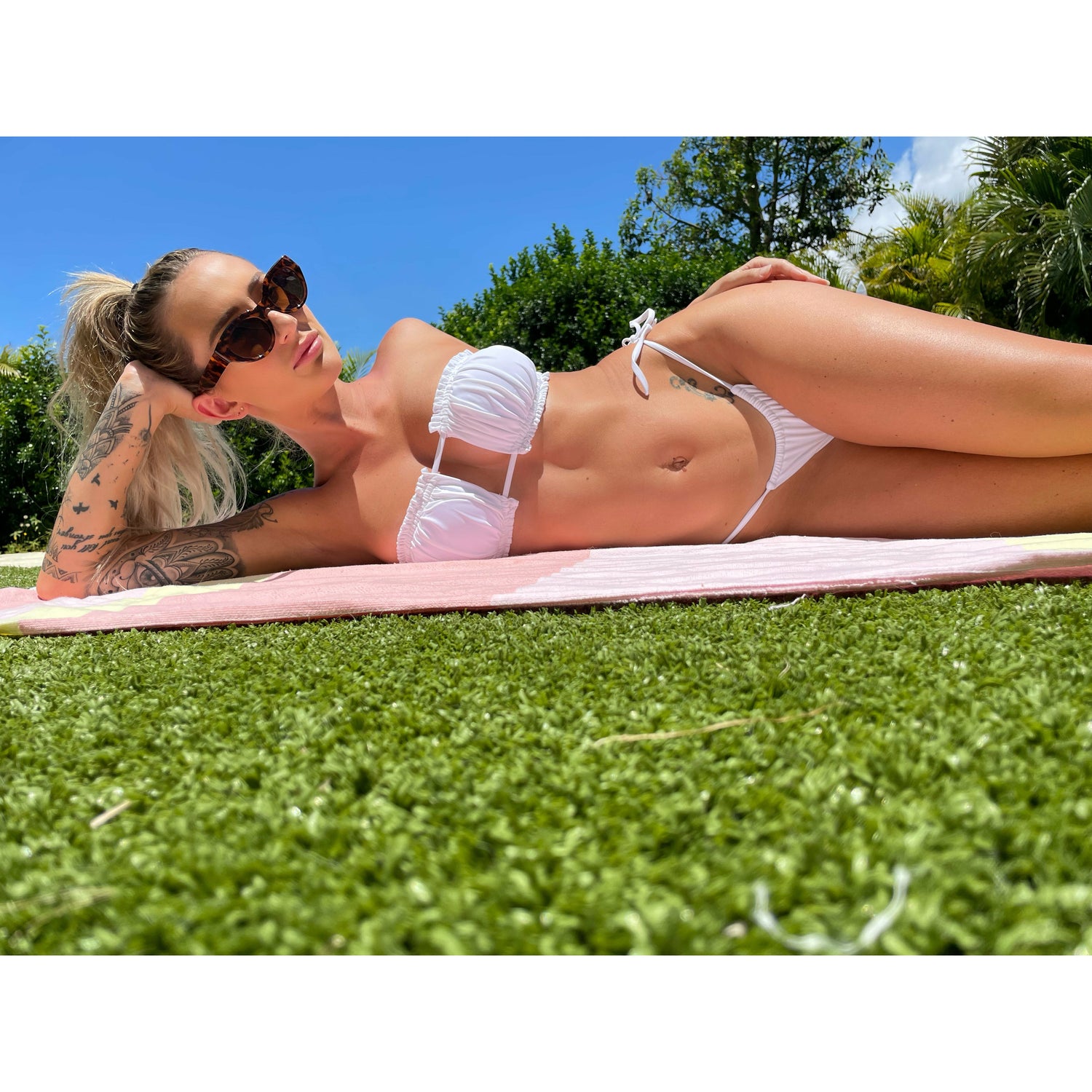 Model is a size 8 normally and is wearing a M. She is 168cm tall and wears a size D breast cup.